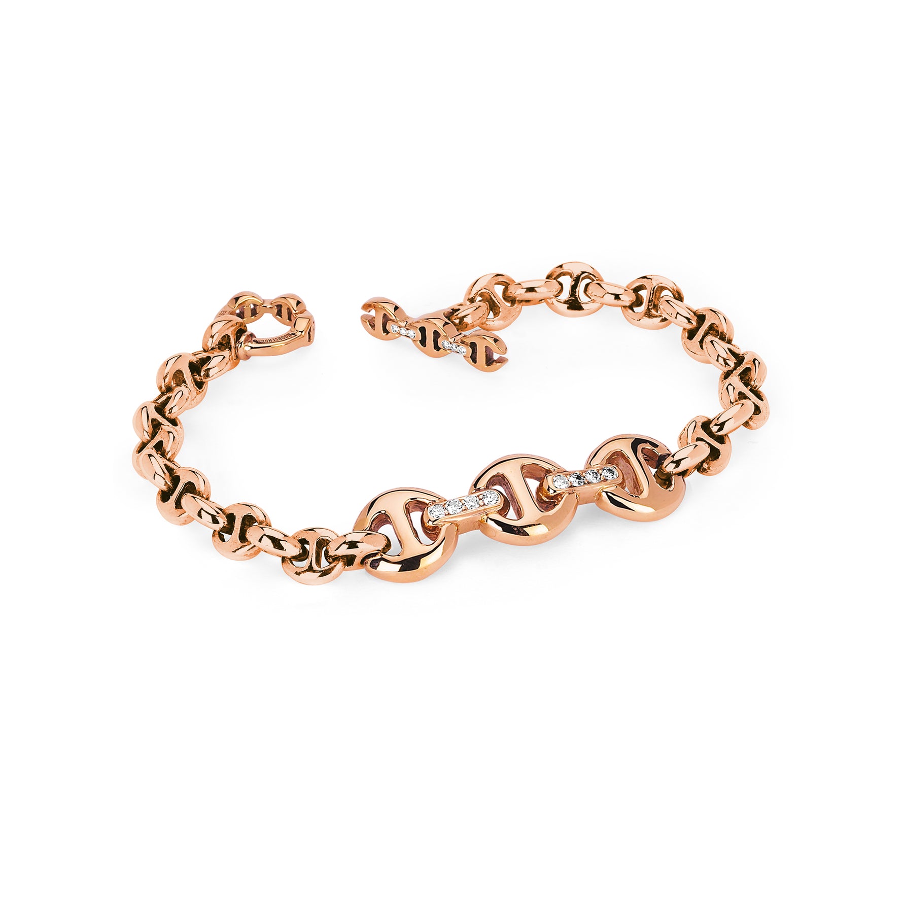 The ID Bracelet is constructed from solid 18K gold and defined by HOORSENBUHS®’ open-link architecture with integrated diamond bridges. A central tri-link element anchors the design, maintaining continuity across the bracelet’s proportional structure.