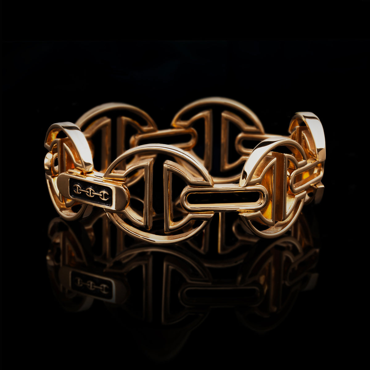 The MMV [large] hinged bracelet, hand crafted with our iconic tri-link motif in 18k gold, features silhouetted iterations of the tri-link with open bridges. The largest and most substantial version in our MMV series with a sophisticated deco face design is a perfect sleek and classic stand alone statement piece.