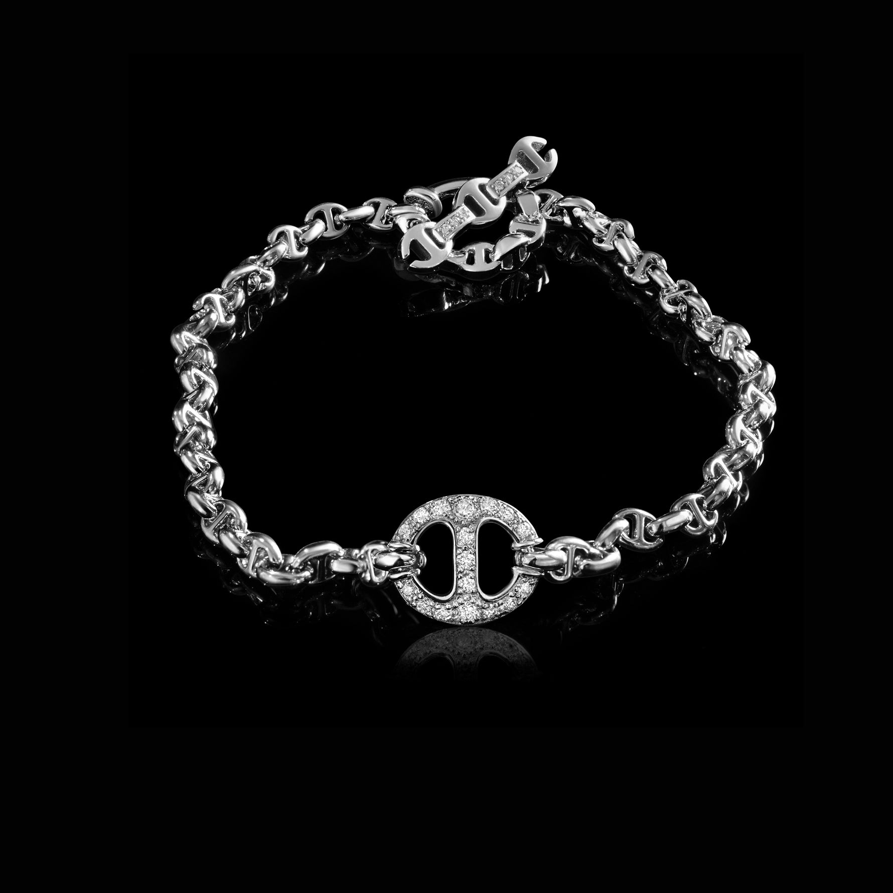 10MM Single-Link with diamonds featured in the middle of a handmade Micro-Link bracelet featuring our iconic tri-link loop and toggle closure.