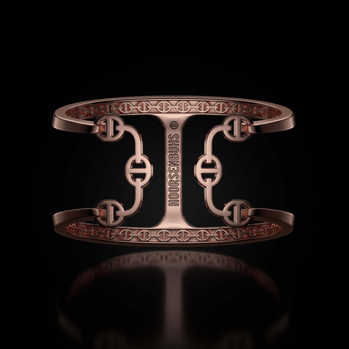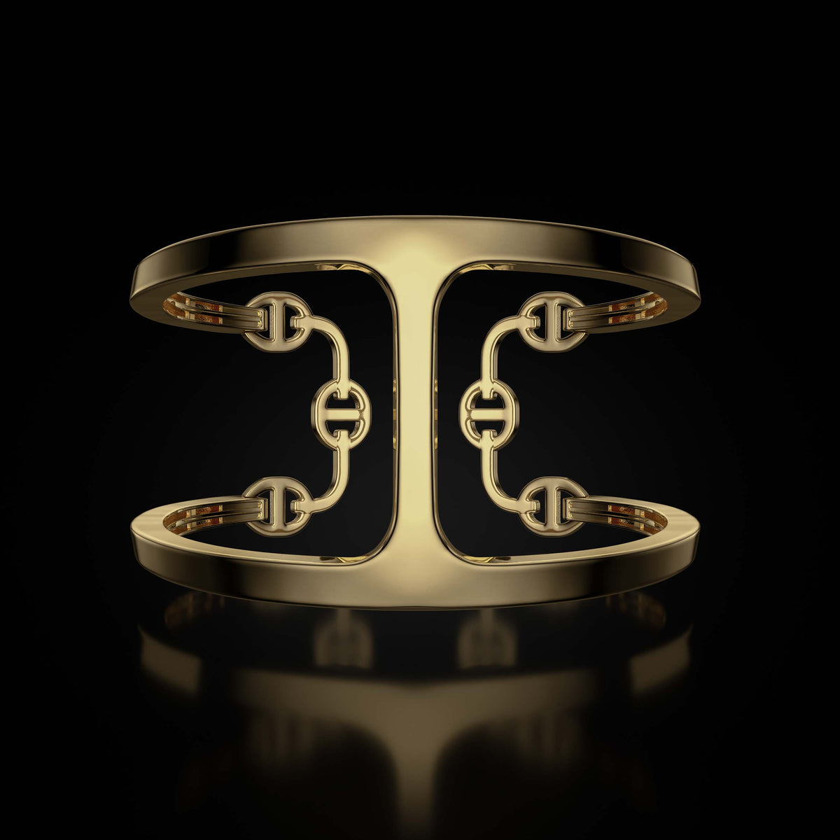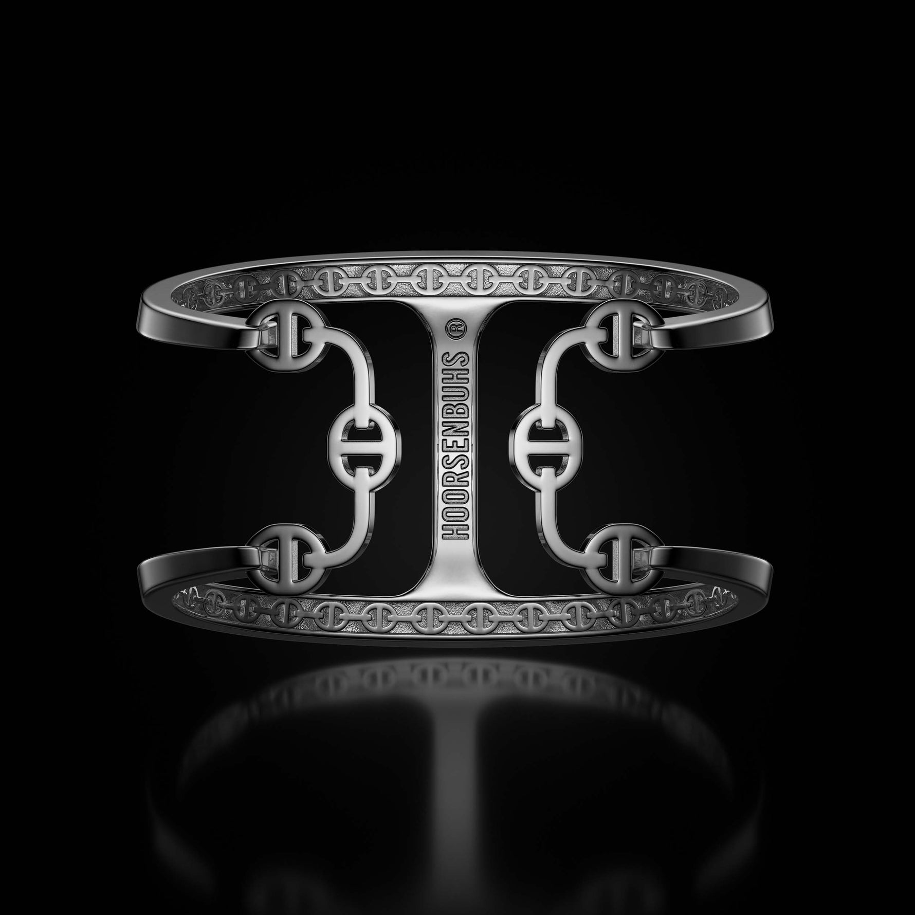 The Phantom Cuff is constructed from solid 18K gold or sterling silver and defined by HOORSENBUHS®’ Phantom link architecture. A single elongated link is wrapped and extended around the wrist to form a continuous open structure.