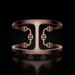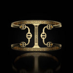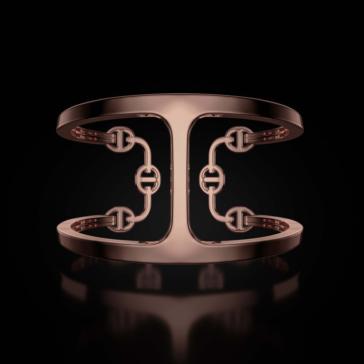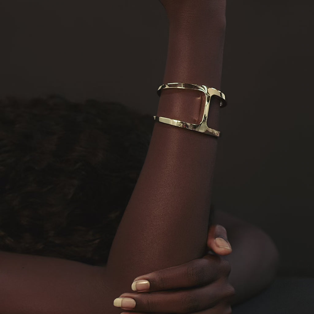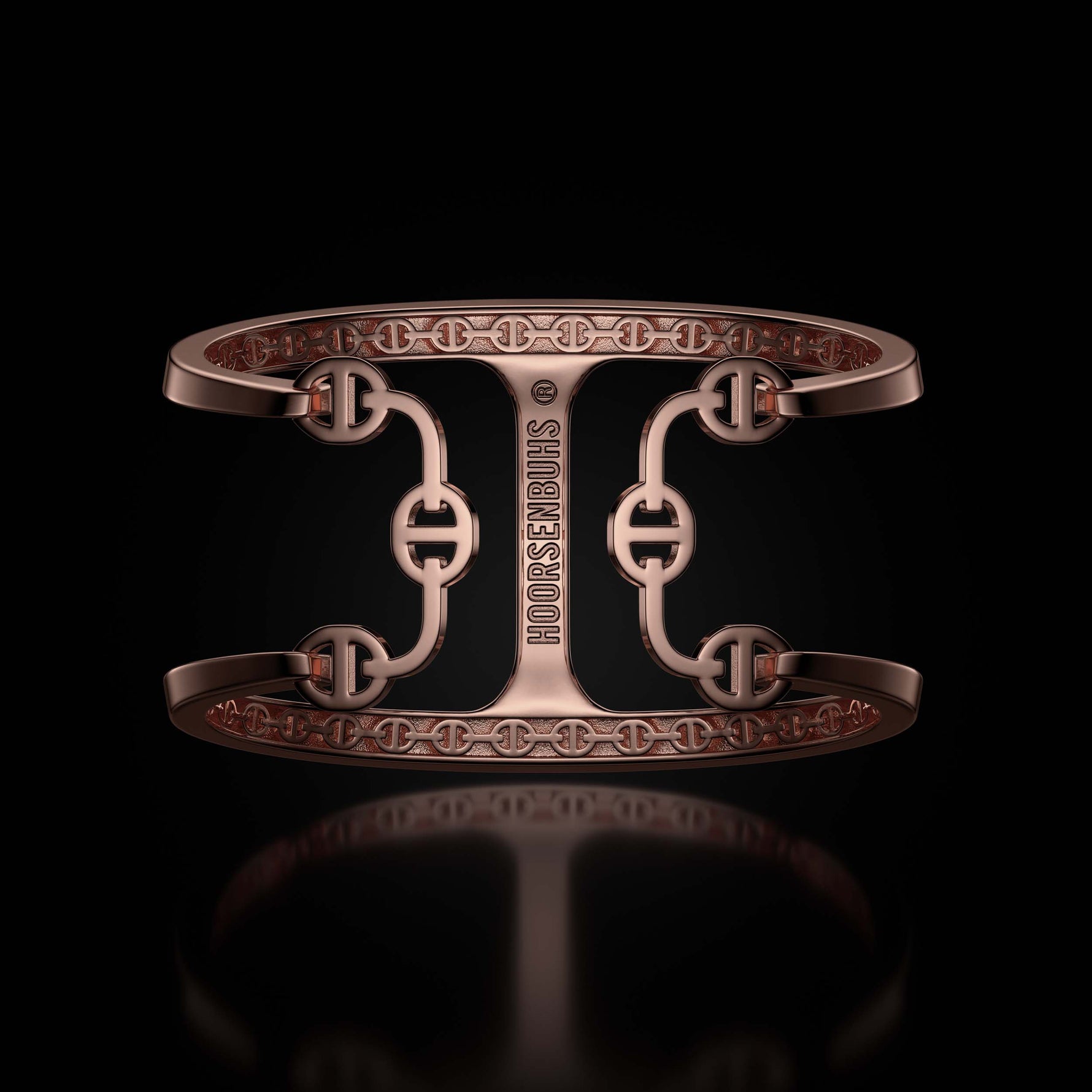 The Phantom Cuff is constructed from solid 18K gold or sterling silver and defined by HOORSENBUHS®’ Phantom link architecture. A single elongated link is wrapped and extended around the wrist to form a continuous open structure.