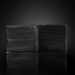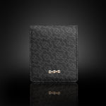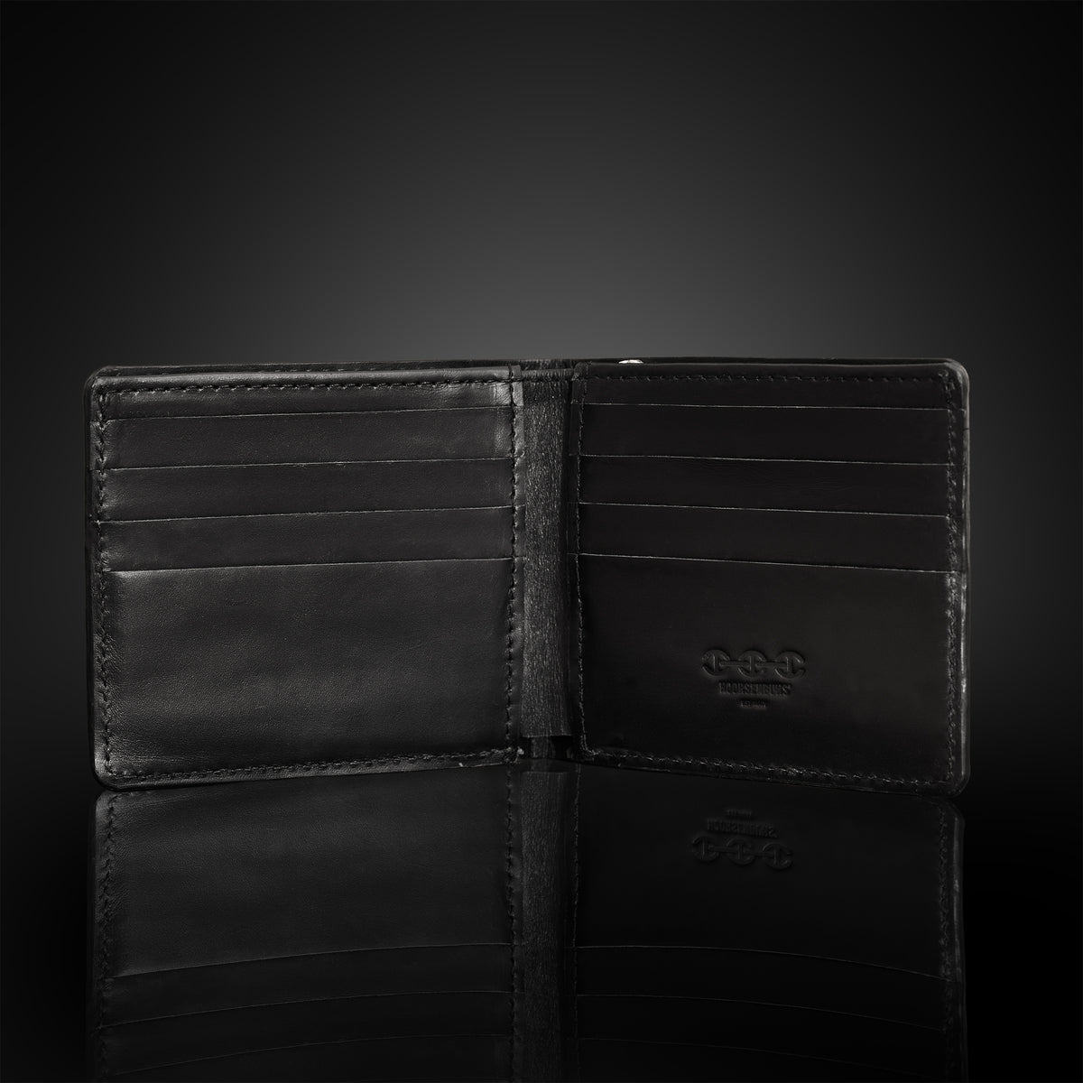 Bi-fold monogram wallet featuring a printed nylon shell with Hoorsenbuhs' signature monogram, a calfskin leather interior, .925 sterling silver tri-link pin and wallet chain ring.  Ethically made in Los Angeles.
