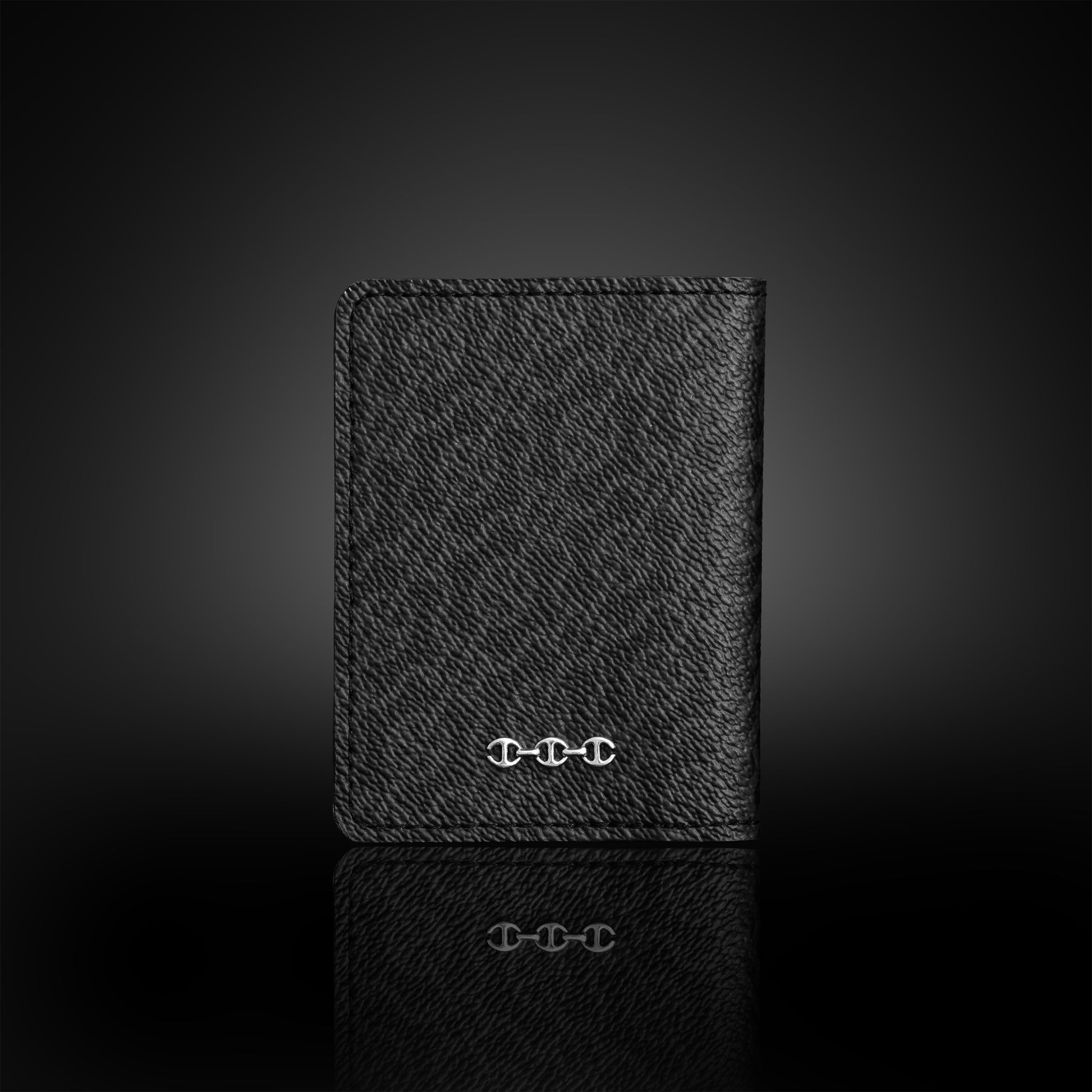 Bi-fold monogram cardholder featuring a printed nylon shell with Hoorsenbuhs' signature monogram, a calfskin leather interior, and .925 sterling silver tri-link pin. Ethically made in Los Angeles.