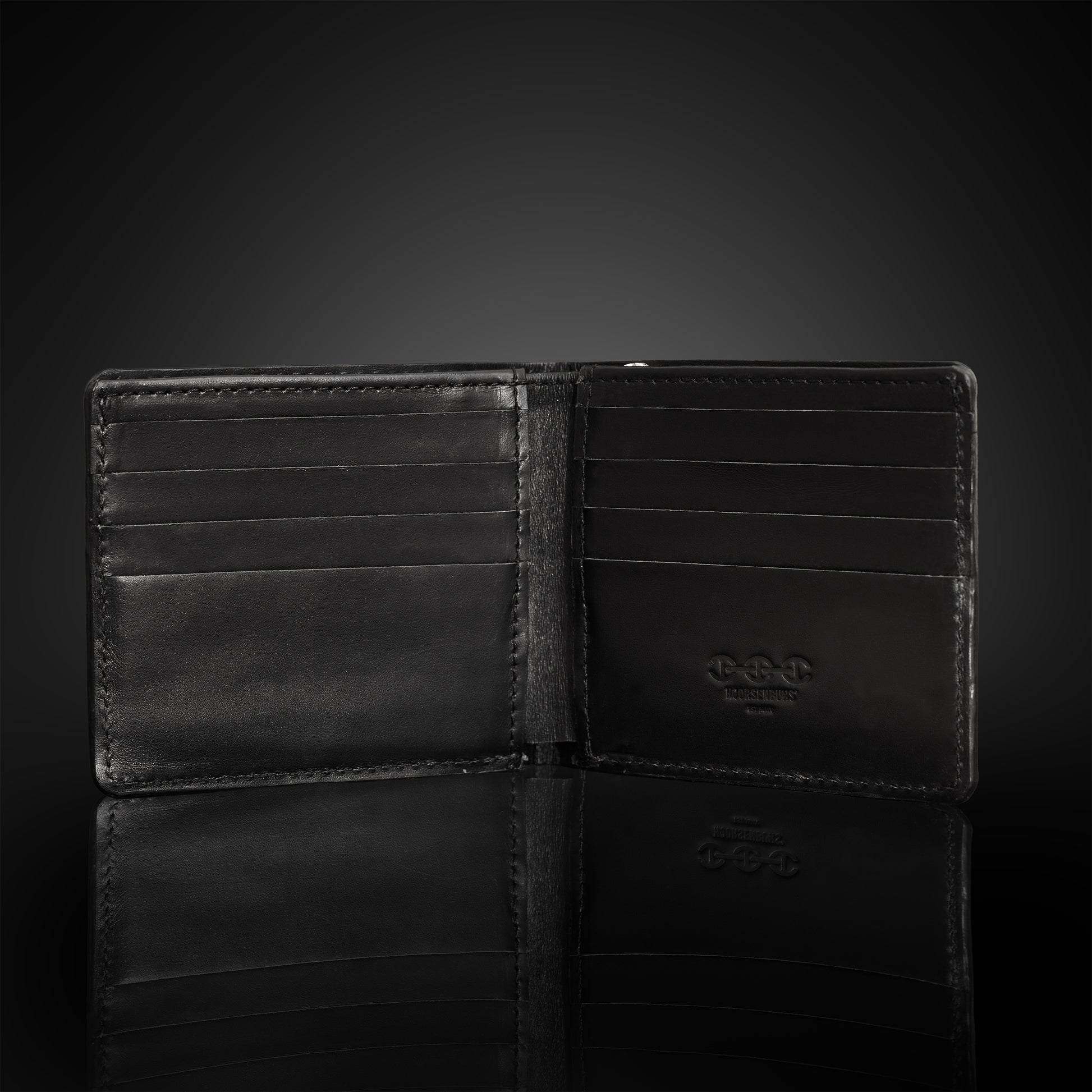 Bi-fold monogram wallet featuring a printed nylon shell with Hoorsenbuhs' signature monogram, a calfskin leather interior, .925 sterling silver tri-link pin and wallet chain ring. Ethically made in Los Angeles.