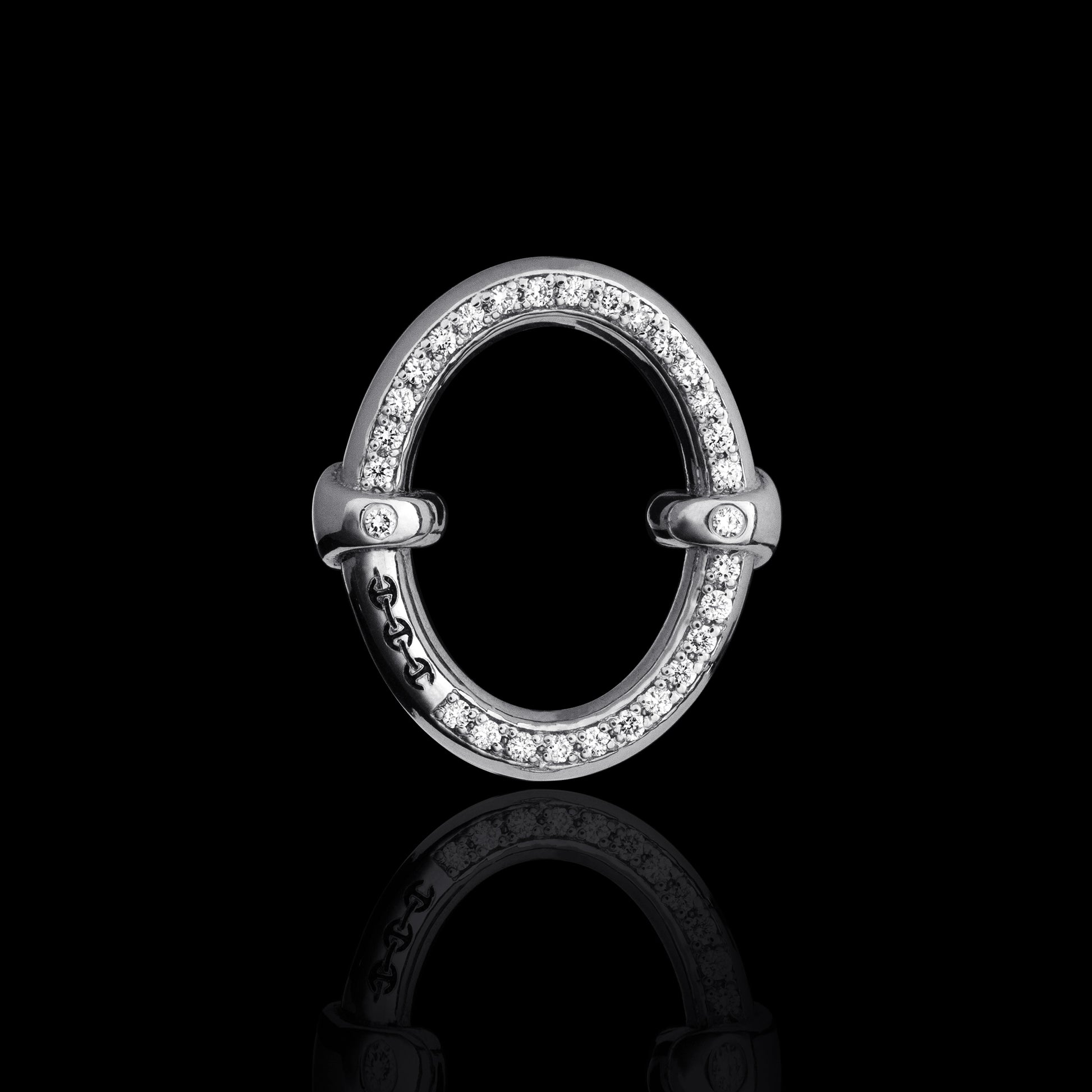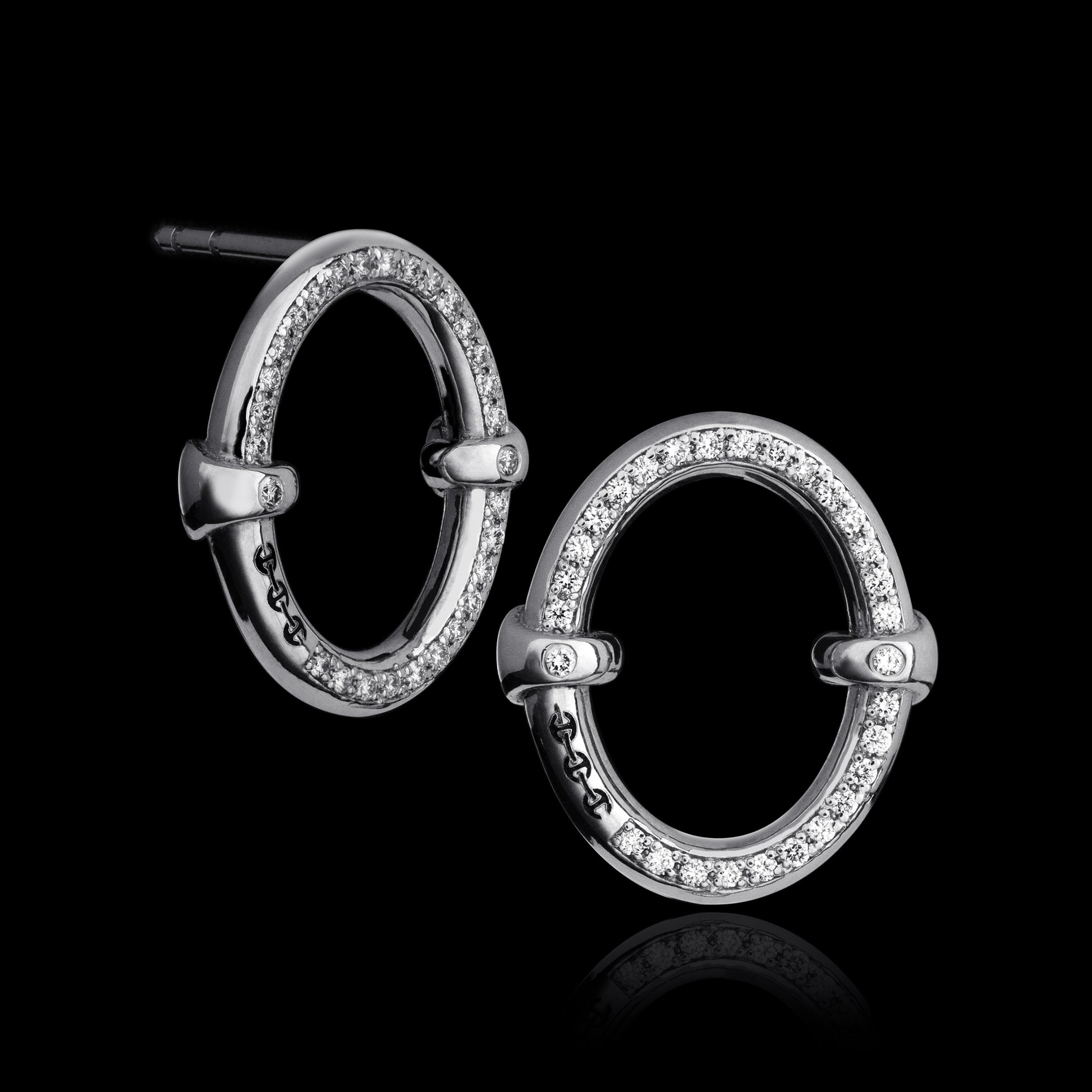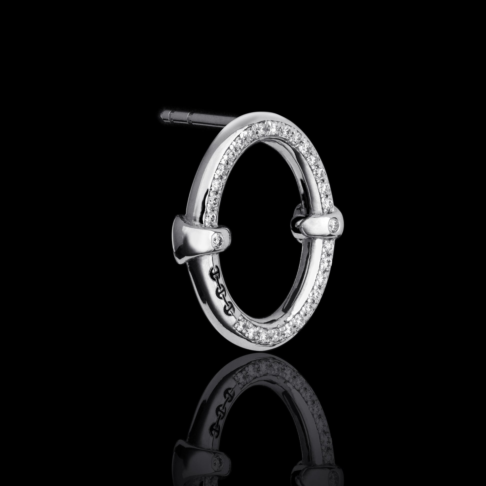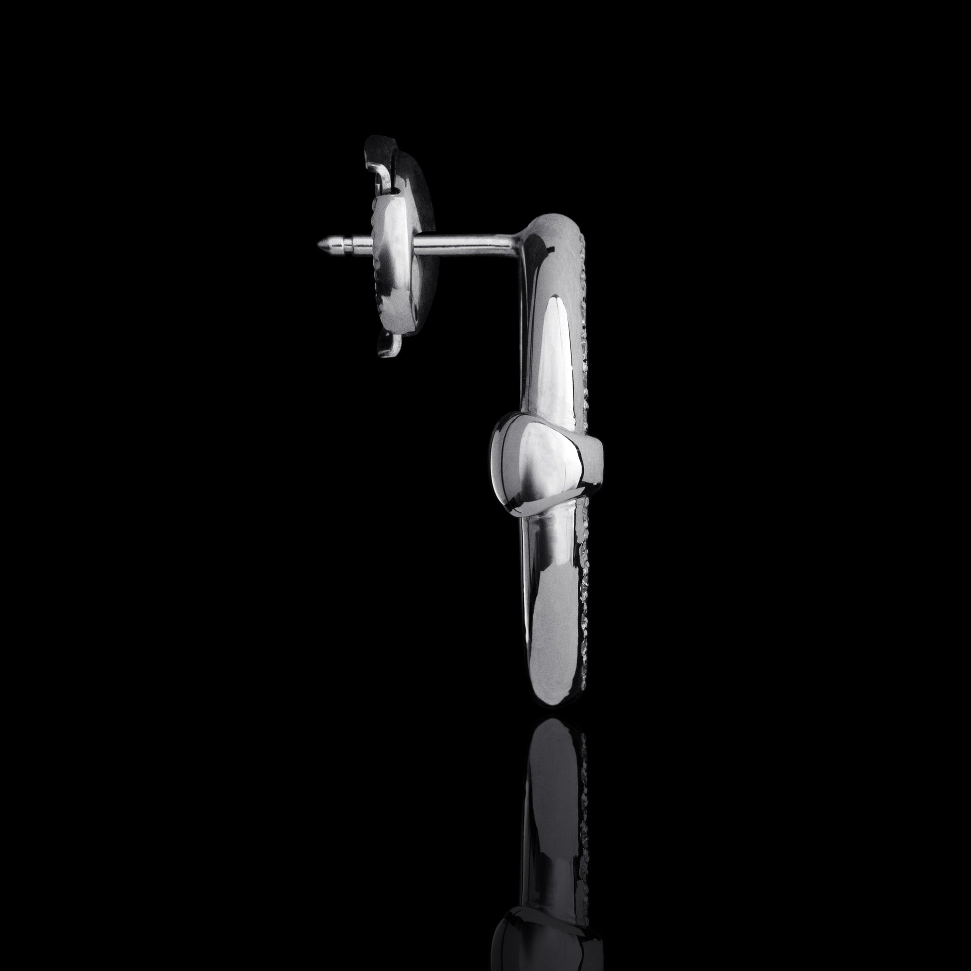 An elongated oval earring with a fully pavé-set diamond surface.