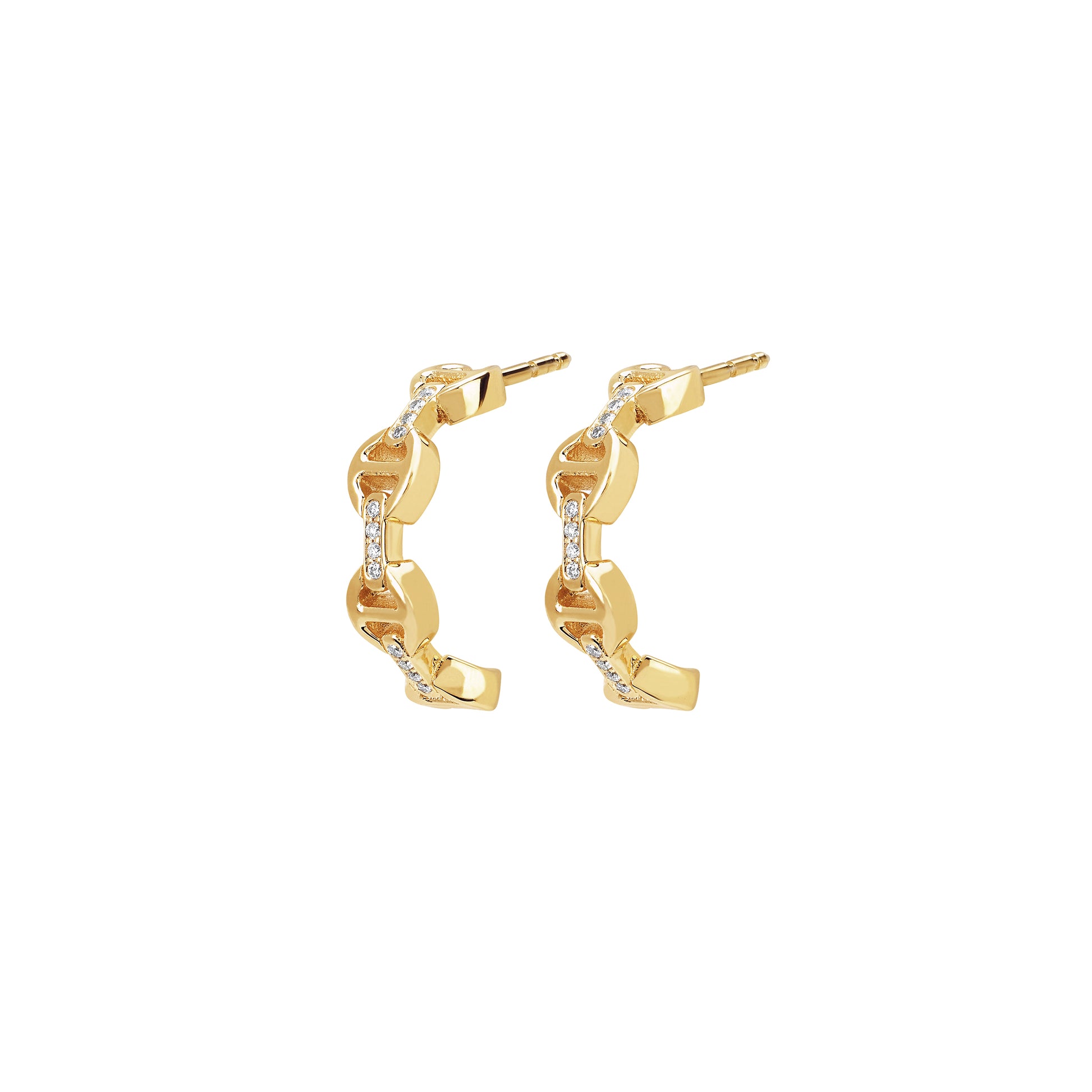 A micro crescent shaped semi-circle earring featuring our iconic anchor chain links in 18k gold with diamond accents on the bridges.