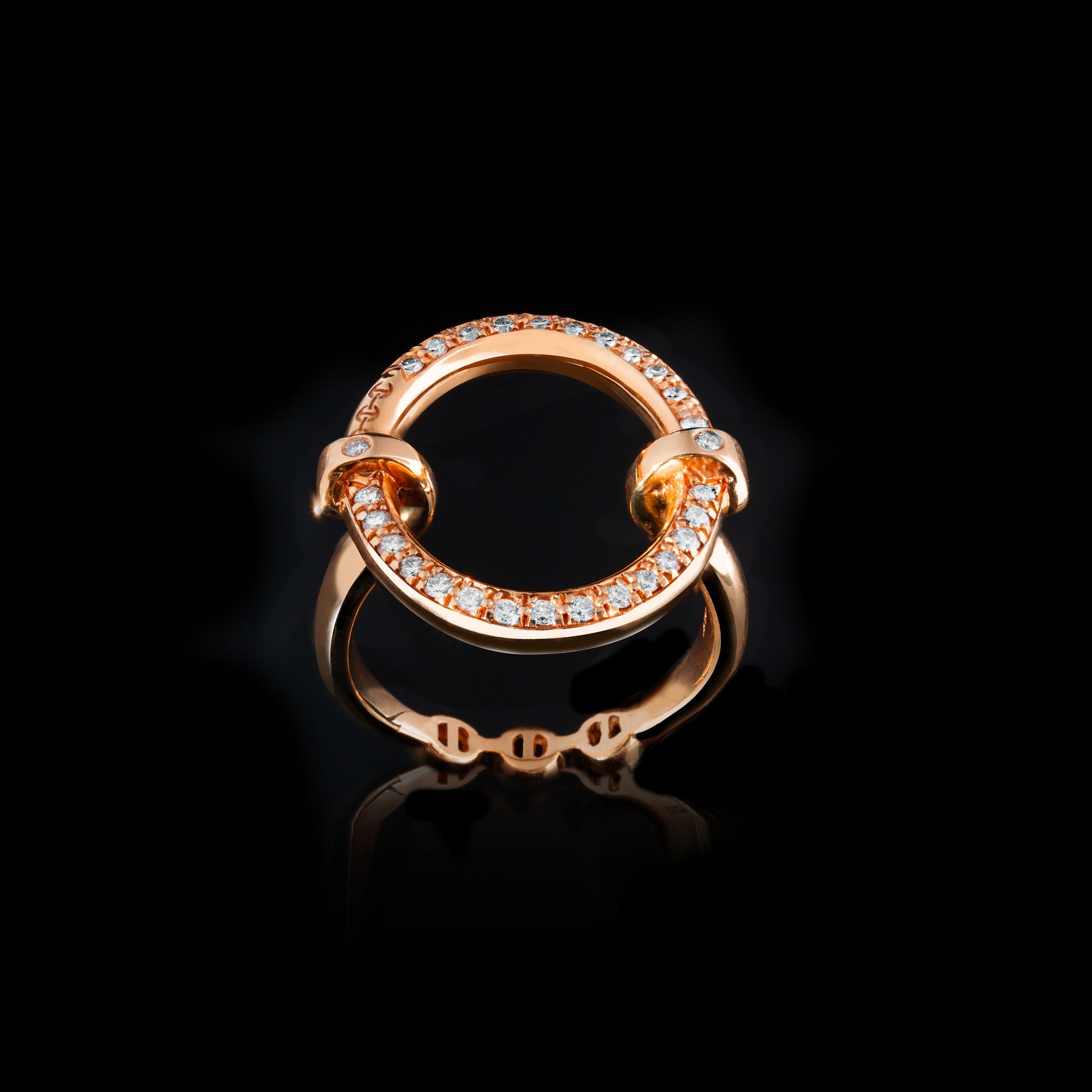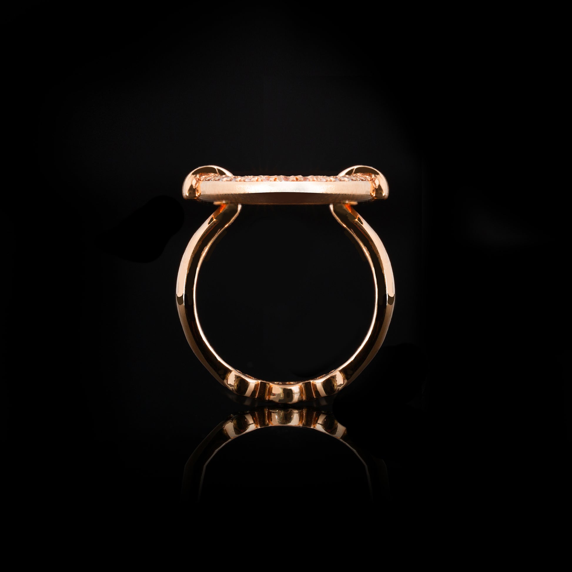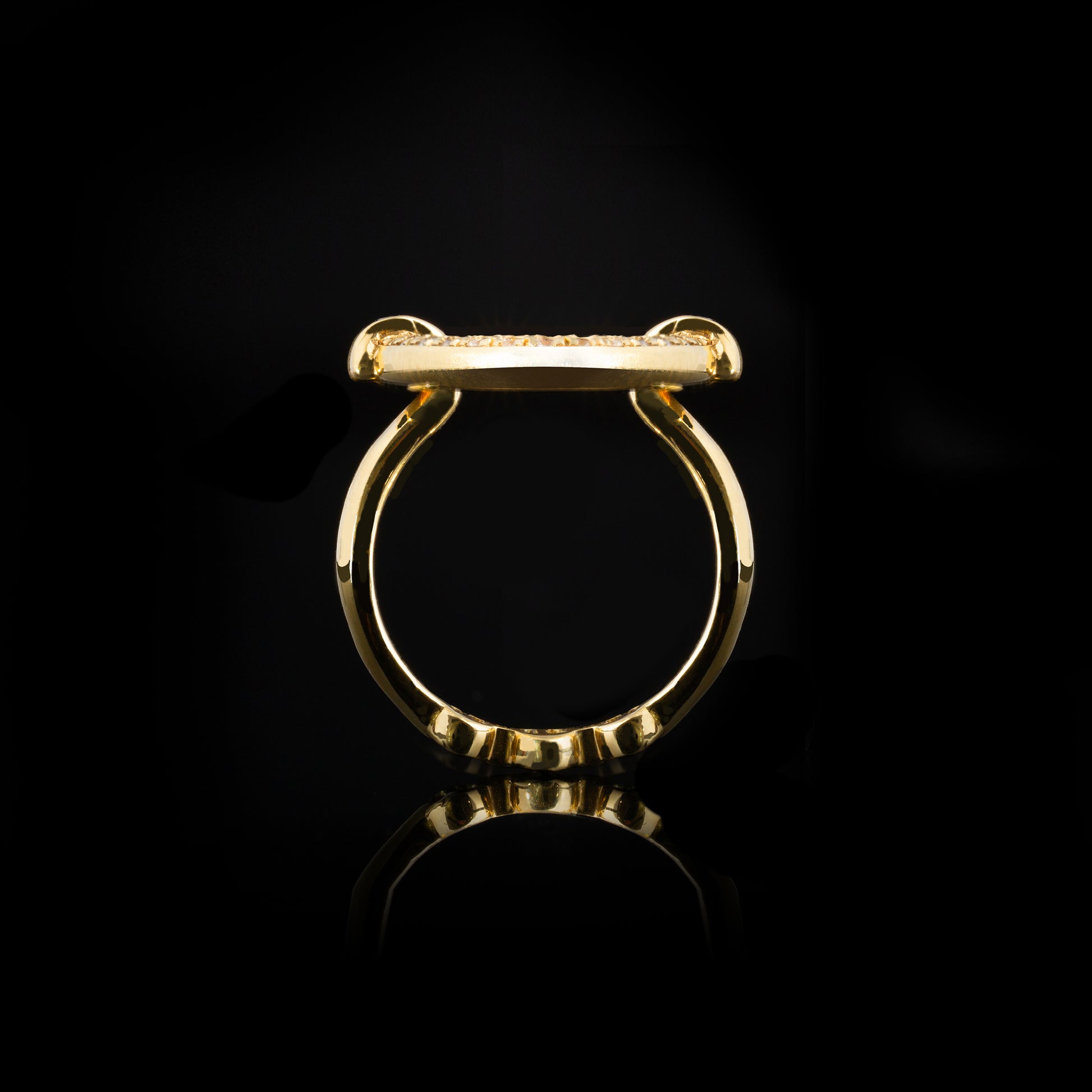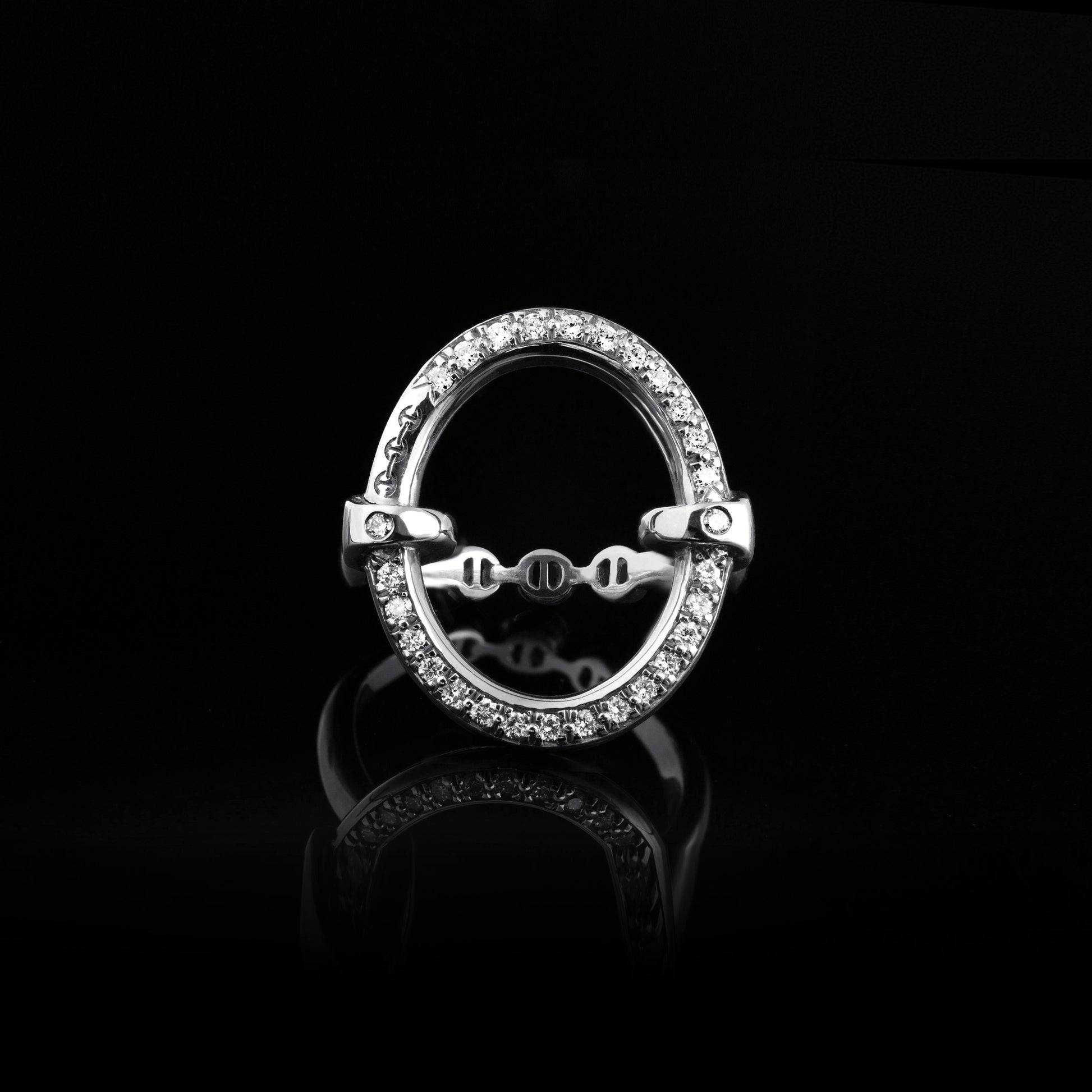 An open oval silhouette set entirely with pavé diamonds, anchored on a band with our signature tri-link detail.