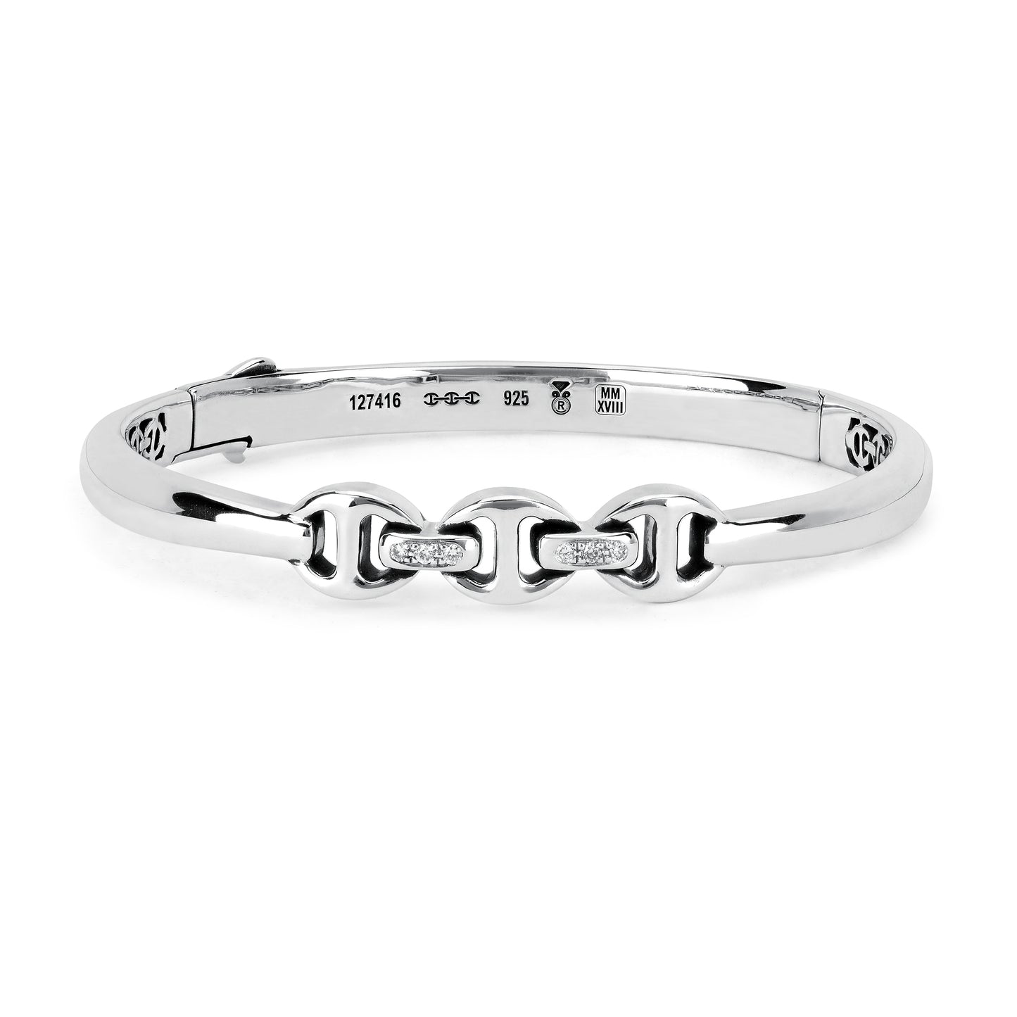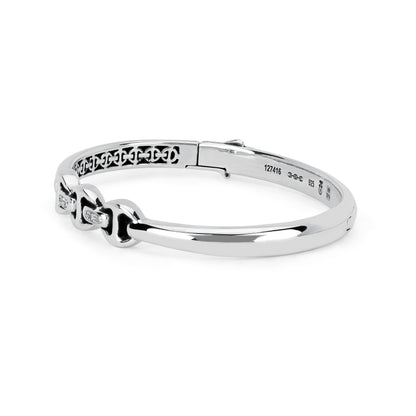 A fused single band hinged cuff bracelet with our iconic tri-link detail in the center with diamond bridges.