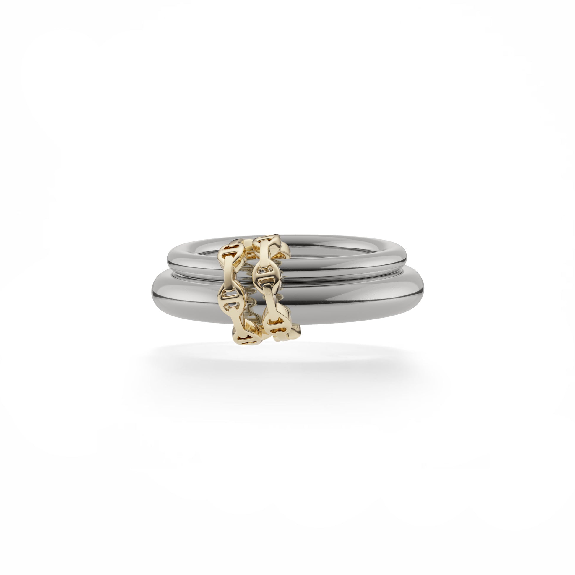 The Virgo Noir HB ring is comprised of two linked Spinelli Kilcollin bands in 18k black gold with two 18k yellow gold Hoorsenbuhs connectors.